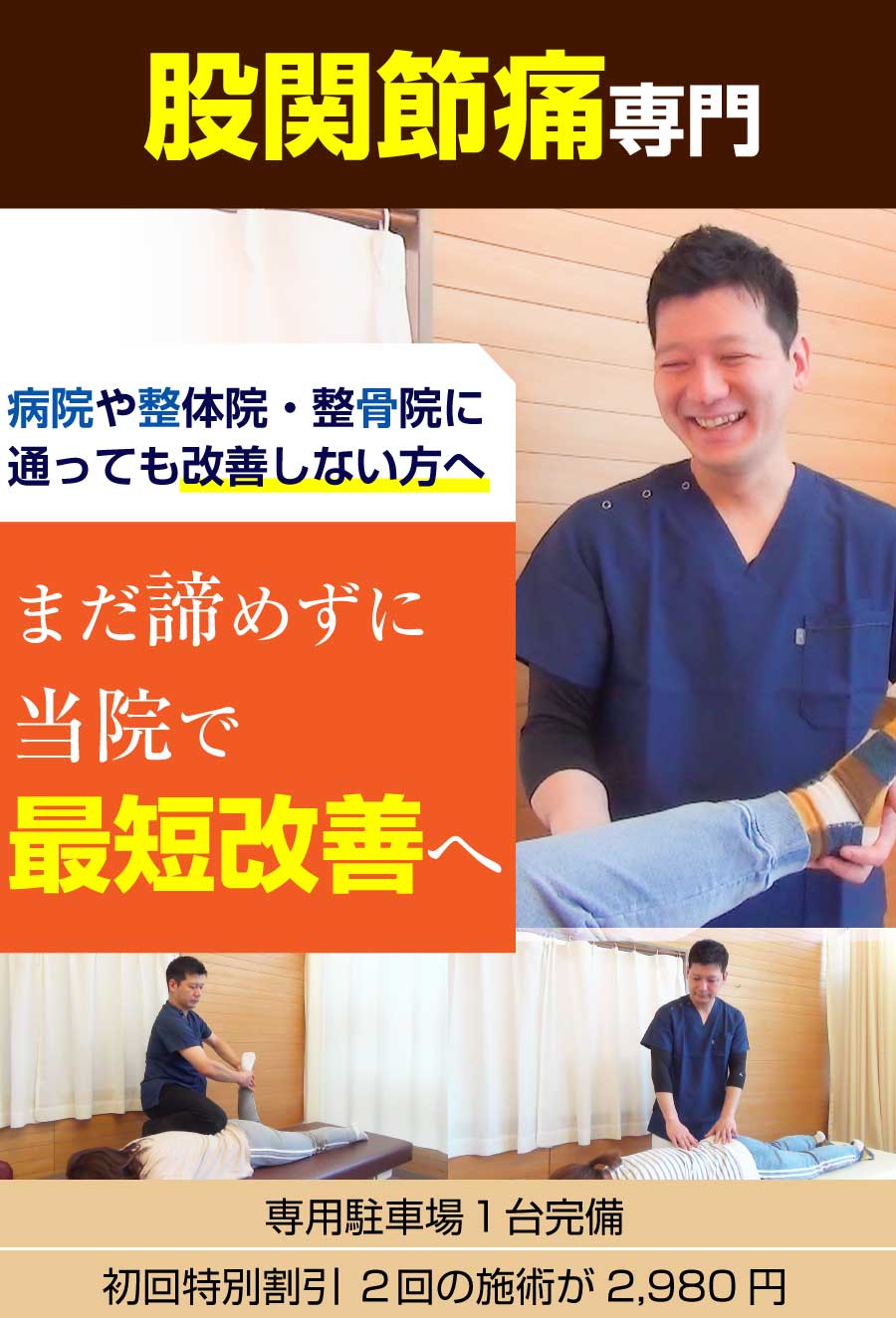 | 診療項目 | 腰痛、坐骨神経痛、ヘルニア、肩こり、頭痛など |