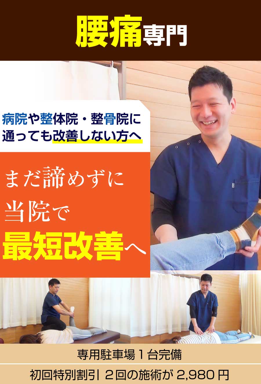 | 診療項目 | 腰痛、坐骨神経痛、ヘルニア、肩こり、頭痛など |